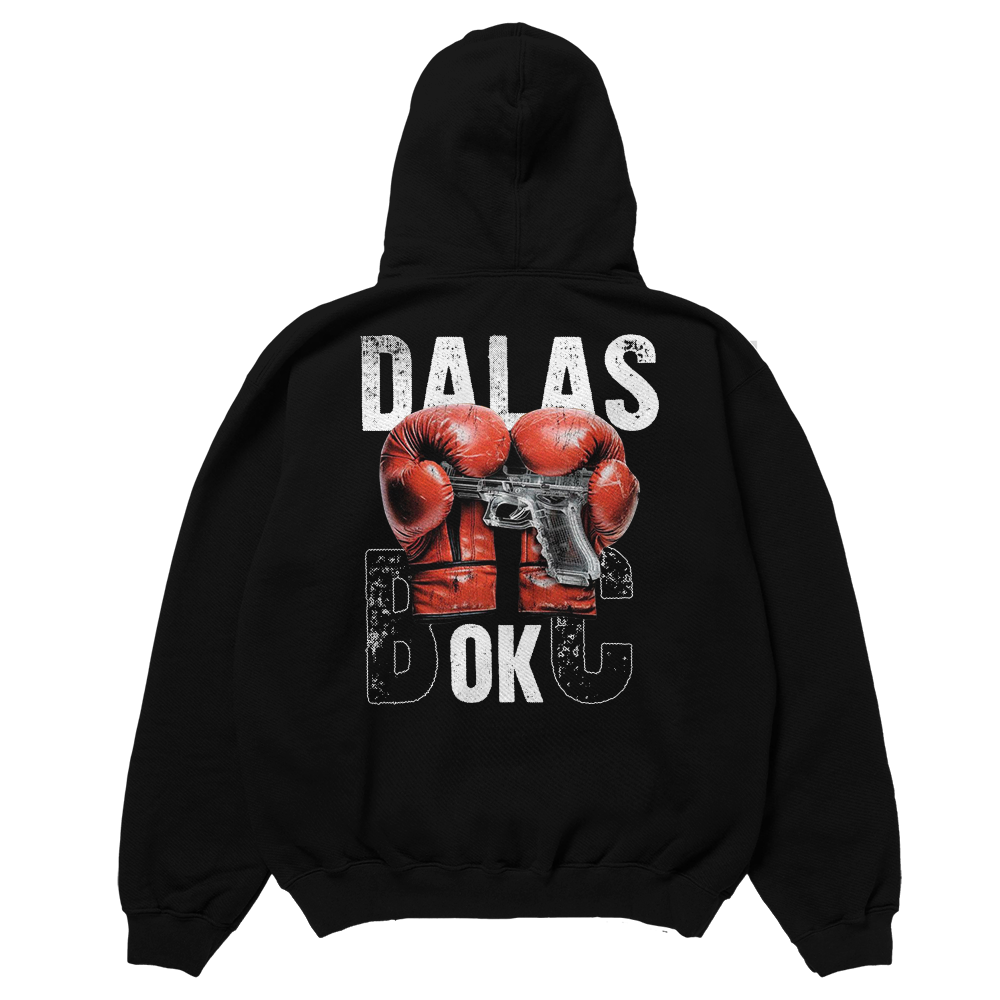 Худи сочетает силу боксерских перчаток и холодный металлизированный блеск пистолета.
